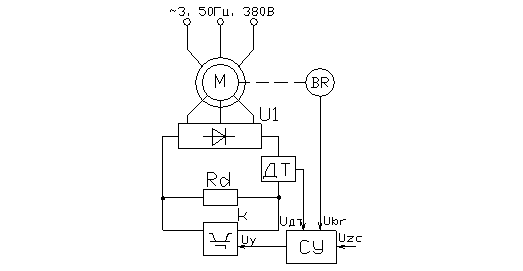 рис.1. На представленной схеме: М – асинхронный двигатель с фазным ротором; BR – тахогенератор; U1 – трехфазный мостовой выпрямитель, включенный в цепь ротора; ДТ – датчик тока; Rd – добавочное сопротивление, шунтированное ключом с частотой коммутации fk=3кГц; К – коммутатор; СУ – система управления. Дополнительный резистор Rd включен в цепь ротора через неуправляемый выпрямитель U1. Коммутатор (ключ) К периодически закорачивает сопротивление Rd, причем скважность g= tвкл/Тком может изменяться внешним сигналом Uzc в пределах от 0 до 1. При g=0 т.е. при не включенном коммутаторе, сопротивление роторной цепи составит Rr+Rd, что определит механическую характеристику 2 (рис.2). При g=1 (ключ включен постоянно) Rd=0 и двигатель работает на характеристике 1, близкой к естественной (рис.2). Плавное изменение величины скважности в пределах 0< g<1 обеспечивает семейство характеристик, расположенные между характеристиками 1 и 2. Величина g в данном случае зависит от величины тока и скорости. Импульсно-ключевой способ управления АД имеет ряд преимуществ: Высокое быстродействие; Переход с характеристики на характеристику при переходных процессах плавный, без скачков тока и момента, что повышает надежность системы. Наряду с этими достоинствами данный способ имеет очень существенный недостаток: Регулирование скорости осуществляется путем повышения скольжения, что приводит к увеличению потерь. Поэтому ИКР следует применять только в старых электроприводах в качестве их модернизации, и то только тогда, когда двигатель работает на низких скоростях непродолжительное время. 2. Расчет характеристик асинхронного двигателя По уточненной формуле Клосса рассчитываем значения момента и скорости:
