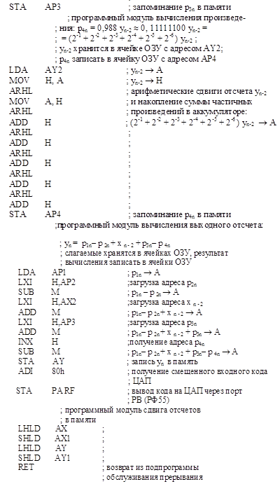 Рис. 2. Общий алгоритм функционирования фильтра 4. Обоснование аппаратной части устройства Основой аппаратной части устройства является многопроцессорный набор К1821 , в состав которого входят три микросхемы: - К1821ВМ85 – микропроцессор; - КР1821РФ55 – ПЗУ с двумя портами ввода/вывода , работающими в режиме простого обмена; - КР1821РУ55 – ОЗУ, таймер и два направленных порта ввода/вывода. Выходной сигнал должен иметь аналоговый вид, для преобразования цифрового кода в аналоговый сигнал , используя ЦАП типа К572ПА1. Микросхема ЦАП К572ПА1 преобразует 10 – разрядный входной параллельный двоичный код в ток на аналоговом выходе, пропорциональный значениям кода и опорного напряжения. Для преобразования кода в ток используют внешний источник опорного напряжения и матрица резисторов R – 2R. В устройство РФ55 входит ПЗУ емкостью 2К х 8 бит и два 8-разрядных порта ввода – вывода. Каждая линия обоих портов может программироваться индивидуально и определяться как входная или выходная. Порты могут работать только в режиме простого обмена без каких-либо сопровождающих сигналов, причем выводимый байт запоминается в буферном регистре порта, а вводимый – не запоминается. В устройство РУ55 входит статическое ОЗУ емкостью 258 х 8 бит, два 8-разрядных (А и В) и один 6-разрядный (С) порты ввода-вывода и 14-разрядный программируемый счетчик/таймер. Все разряды портов А и В используются для ввода-вывода параллельно, т.е. невозможна установка направления передачи индивидуально для каждого разряда. Порты А и В содержат буферные регистры для запоминания пересылаемого байта данных. Для преобразования выходного тока в выходное напряжение, пропорциональное значению входного кода, требуются внешние операционные усилители (ОУ) с цепью отрицательной обратной связи. 5. Разработка и отладка программы на языке команд микропроцессораРабочая программа разработана на основе спроектированного алгоритма функционирования устройства и результатов анализа и формализации задачи. Программа привязана к минимальной конфигурации аппаратной части фильтра. Распределение памяти ПЗУ : 0000h….003Bh – программа инициализации; 003Ch….07FFh – программа реакции на прерывание RST6.5. Распределение памяти ОЗУ : 5000h, 5001h, 5002h – хранение отсчетов xn , xn – 1 , xn – 2 ; 5003h, 5004h, 5005h – хранение отсчетов yn , yn – 1 , yn – 2 ; 5006h, 5007h, 5008h, 5009h – хранение произведений p 1 n , p2 n , p 3 n , p 4 n ; 50FFh – начальный адрес стека. ;Программа "Фазовый корректор " ;Автор: студент гр.114 Тришин Сергей Викторович ;Дата: 10 апреля 2004 г. ;Разностное уравнение: yn = 0,988 xn – 1,6 xn – 1 + xn – 2 + 1,6 yn – 1 –0,988 yn – 2 ; ;Определение символических имен