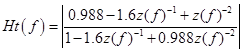 Необходимо провести коррекцию в программе, заменив эти константы. 8. Расчет АЧХ и ФЧХ устройства для заданных и реальных значений коэффициентов. Оценка устойчивости устройства Разностное уравнение проектируемого фильтра в общем виде можно представить следующим образом: yn = b 0 x n + b 1 x n – 1 + b 2 x n – 2 – a 1 y n – 1 – a 2 y n – 2 Коэффициенты bi , ai определяют характеристики фильтра. Значения коэффициентов: b 0 = 0.988;b 1 = -1,6;b 2 = 1; a 1 = -1.6;a 2 = 0.988 Разностное уравнение задает во временной области порядок получения выходной последовательности отсчетов из входной. Приведенное уравнение соответствует однокаскадному цифровому фильтру: каскад вычисляет выходную последовательность yn . В z-плоскости свойства цифрового фильтра описывает передаточная функция H(z), которая при однокаскадной структуре и для приведенного выше разностного уравнения имеет вид: