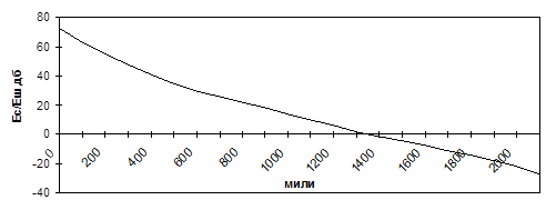 Построить график соотношения с/ш на входе приёмника в зависимости от дальности. Из графика определить максимальную дальность, соответствующую наименьшему допустимому соотношения для каждого с/ш для каждого из уровней отсчёта. Дальность приема поверхностных сигналов РНС «Лоран‑С» зависит главным образом от излучаемой мощности радиоимпульсов, уровня помех в точке приема, ширины полосы пропускания приемника судовой аппаратуры системы и подстилающей поверхности на трассе распространения радиоволн. Для построения графика сигнал/шум на входе приемника воспользуемся рисунком 2.18. учебника [1]. Возьмем из графики зависимость напряженности поля поверхностных волн при излучаемой мощности 100кВт и пересчитаем его применительно к заданной мощности по формуле: