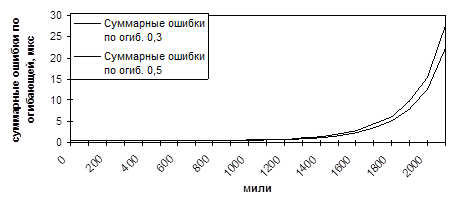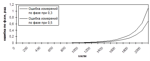 где tз – задержка пространственных сигналов по отношению к поверхностным (рис. 2.19. учебника [1].) Ошибка измерения фазы и огибающей появляется при задержке отраженного сигнала относительно поверхностного меньше, чем tз то есть tз < tо . Судя по графику (рис. 2.19. учебника [1].) в нашем случае ошибка имеет место быть при уровне слежения 0,5 начиная с дистанции 900 миль т. к. в остальных случаях не выполняется выше сказанное условие. Данные расчетов приведены в таблице 4. Таблица 4.