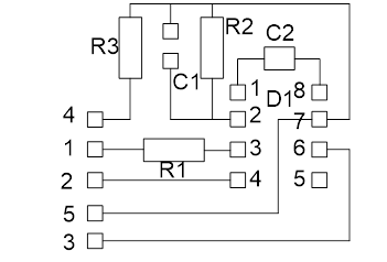 Рисунок 2. Комутаційна схема 2.2 Розрахунок плівкових та навісних елементів Для розробки ГІМС нам дана схема електрично-принципова. Схема електрично принципова – це документ, який визначає повний склад електричних елементів і електричного зв’язку між ними. Вона дає детальну уяву про принципи роботи нашого виробу. По схемі розроблюють конструкцію, а також використовують її при виготовленні і експлуатації виробу. За електричною схемою розробляється мікросхема. Мікросхема-пристрій розміром порядку 1мм2 і менше; зазвичай виконує яку-небудь самостійну функцію, наприклад складання поданих на неї електричних імпульсів, і називається інтегральною. Окремі елементи мікросхеми, наприклад провідники, резистори, можуть бути утворені шляхом нанесення плівок на діелектричну пластинку-підкладку (плівкові елементи). Це плівкова технологія виготовлення. Інші елементи, які називаються навісними, наприклад напівпровідникові діоди і транзистори, приклеюють і припаюють до підкладки. При поєднанні тих і інших елементів утворюється мікросхема, яка називається гібридною. В даній роботі на ГІМС будуть такі елементи: два конденсатори, три резистора і навісна мікросхема 740 УД5-1. Електрична принципова схема по вказаному завданню на форматі А4-схема і перелік елементів схеми. Відстань таблиці переліку від верхньої рамки не регламентовано, тому можна витягнути схему на всю довжину листа, якщо треба, а таблицю змістити вниз. Відстань між умовними позначеннями не потрібно занадто збільшувати, розміщення елементів повинно визначатись зручністю читання схеми, їх можна креслити з поворотом на кути кратні 900 . Електричні зв’язки між елементами зображують найкоротшими лініями мінімальною кількістю перетинів, на відстані не менше 3 мм одне від одного. Входи, виходи та контакти розташовують справа і зліва. Порядок запису в перелік елементів схеми, спочатку резистори, потім інші елементи в алфавітному порядку умовних позначень. В межах кожної групи елементів, ті які входять в неї записують під загальним заголовком, по зростанню порядкових номерів. В кінці групи рекомендується пусту стрічку для доповнень. Далі розрахуємо компоненти ГІМС, розведемо схему. Компонентами ГІМС є діоди та діодні матриці, транзистори, конденсатори, трансформатори та ін. Компоненти можуть мати жорсткі та гнучкі виводи і спосіб монтажу компонентів на плату повинен забезпечити фіксацію положення компонента і виводів, збереження його цілісності, параметрів і якостей, стійкість до вібрацій та ударів. Перейдемо до розрахунку конкретної схеми. Користуючись заданими параметрами (U=5 В, табл. 1), розрахуємо площі плівкових резисторів. Почнемо розрахунки з визначення потужності P і сили струму I, за формулами [4]: