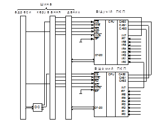 Рисунок 2. - Схема каскадного підключення двох контролерівпереривань до шин 8-розрядного МП пристрою Для приведення ПКП в робочий стан прикладна програма має завантажити в нього два або три керуючих слів ініціалізації, які виявляють наявність в системі одного або декількох ПКП, початкову адресу масиву підпрограм обслуговування переривань, інтервал розташування початкових адрес підпрограм в пам’яті системи та типи розподілу пріоритетов при одночасному надходженні переривань з двох джерел. Вузол клавіатури і індикації можна організувати по-різному. По-перше, для виводу даних на 7-сегментні індикатори і вводу з клавіатури можна використовувати ППІ КР580ВМ80. Але при цьому такі функції, як усування дріб’язку клавіатури або регенерація відображення на індикаторах, треба виконувати програмним шляхом. По-друге, можна використовувати спеціалізовану ВІС – контролер індикатора і клавіатури КР580ВД79, до складу якої входять схеми усування дріб’язку клавіатури і динамічної індикації. Крім цього, увід із клавіатури можна здійснювати за перериваннями, а вивід на індикацію – з допомогою схем прямого доступу в пам’ять, коли для зберігання образу на дисплеї відводиться конкретний масив елементів в ПЗП. |