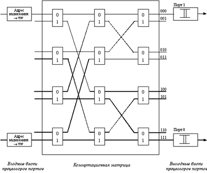 Рис. 2. Реализация коммутационной матрицы с помощью двоичных переключателей В коммутаторах с общей шиной (рис. 3) порты связаны высокоскоростной шиной, обеспечивающей производительность большую, чем суммарная производительность портов. Сообщения по внутренней шине должны передаваться небольшими порциями – ячейками, это необходимо для предотвращения задержек передачи других сообщений. Общая шина не предусматривает буферизации ячеек. Каждый порт принимает все ячейки, с помощью тэгов накапливает в буфере те ячейки, которые адресованы ему и передает их в выходной канал.