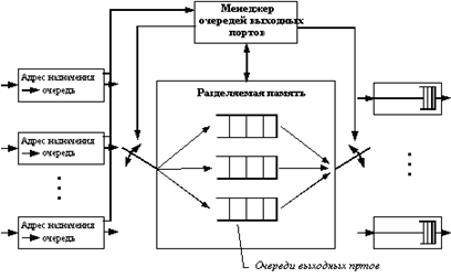 Рис. 3. Архитектура общей шины Взаимодействие портов коммутатора можно организовать с помощью двухвходовой разделяемой памяти (рис. 4). Запись в разделяемую память из входных портов осуществляется также ячейками с помощью менеджера очередей, аналогичным образом производится чтение данных для передачи в выходные порты.