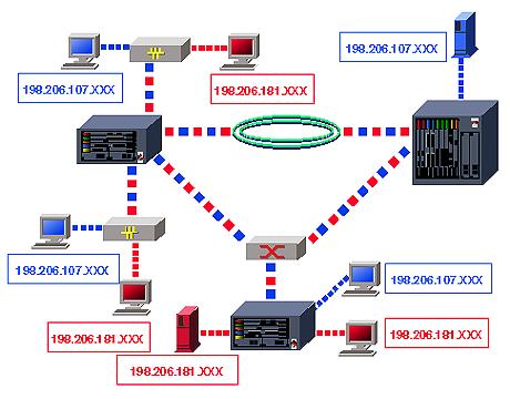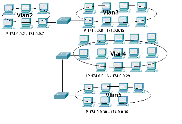 Рис.3.1. Побудова Vlan на основі IP - адресів Основою побудови віртуальних мереж є комутатори з підтримкою даної технології. В більшості випадків це інтелектуальні комутатори з частковими функціями маршрутизаторів, вартість яких становить понад 800y.o. Цей тип віртуальних мереж майже не відрізняється від мереж на базі маршрутизаторів і деякі комутатори нездібні забезпечити потрібну в даному випадку продуктивність. Комутатори Omniswitch та Cisco добре справляються із завданнями цього типу. Розглянемо приклад створення віртуальної мережі на основі комутаторів Cisco. Для здійснення відповідної конфігурації необхідно за допомогою консолі чи іншого з методів отримати доступ до комутатора і виконати наступні кроки: 1.Перейти в превелегійований режим за допомогою команди ENABLE; 2.Перейти до конфігурування віртуальних мереж за допомогою команди batabasevlan; 3.Створити віртуальну мережу за допомогою комани vlan(1-1000) name (ІМ’Я); 4.Додати до створеної віртуальної мережі мережеві адреси підрозділу. Згідно описаних вище кроків необхідно створити на Switch1 віртуальну мережу Vlan 2 з назвою direct (switch1(vlan)#vlan 2 namedirect), до якої будуть додані на основі їх мережених адрес користувачі з підрозділу дирекції, та Vlan3 з назвою buhgalt, до якої будуть додані користувачі з відділу бухгалтерії. Додатково також необхідно описати Vlan4 та Vlan5 з назвами tech та expl і додати до них підрозділ експлуатації планово-технічний підрозділ. Даний алгоритм необхідно повторити для свічів на першому та другому поверхах будівлі. Віртуальні мережі із порядковим номером „1” використовувати заборонено, оскільки цей номер зарезервований для використання Vlan по замовчуванні. Для здійснення обміну інформації між користувачами, що під’єднані до різних комутаторів в межах однієї віртуальної мережі, або ж для доступу до Інтернету певної частини користувачів, що належать до віртуальних мереж, необхідно додатково налаштувати технологію транкінгу та створити на комутаторах транкінгові порти. Транковий порт - це порт або група портів, що використовуються для передачі інформації про VLAN в інші мережеві пристрої, що приєднані до цього порту і використовують транковий протокол. Транковий протокол це "мова", яку комутатори використовують для обміну інформацією про VLAN. Приклади транкових протоколів - ISL і IEEE 802.1q. Звичайні порти не рекламують інформацію про VLAN, але будь-який порт може бути настроєний для прийому/передачі інформації про VLAN. Тому необхідно активізувати транковий протокол на потрібних портах, оскільки він вимкнений за замовчуванням. Транковий порт - це порт, призначений виключно для пересилки VLAN інформації використовуючи транковий протокол. Cisco комутатори, в основному, використовують протокол Inter-switchLink (ISL) для забезпечення сумісності інформації. Для автоматичного обміну інформацією про VLAN через транкові порти потрібно налаштувати CiscoVLANTrunkProtocol (VTP), який дозволяє комутаторам посилати інформацію про VLAN у формі "реклами" сусіднім пристроям. Інформація, що передається за допомогою транкінгового протоколу, включає домен, номер версії, активні VLAN і іншу інформацію. Перевагою використання VTP є те, що ви можете контролювати додавання, видалення або зміну мереж VLAN в дизайні вашого комутатора. Недоліком є непотрібний трафік, що створюється на транкових портах для пристроїв, яким можливо не потрібна ця інформа