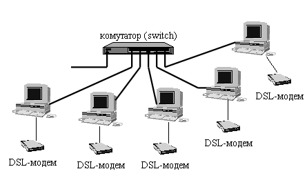 Рис.4.2.Під ’ єднання до Інтернету на основі індивідуальних DSL - модемів. - забезпечити доступ до Інтернету на основі виділеної лінії до провайдера послуг Інтернету.