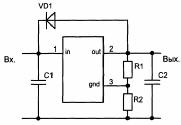 Рисунок 3.2 Схема включення стабілізатора параметричного компенсаційного КР142ЕН12А Значення опору резисторів R1 і R2, що входять до складу дільниказв'язані співвідношенням: де Uвих.min = 1,3В (значення напруги відповідно до технічної документації мікросхеми); Іи.э - струм через резистори R1 і R2 . Розрахуємо виходячи з цієї формули параметри дільника для вихідної напруги 8B, Так як вихідний струм мікросхеми Iвих =0,55 мкА [15], задамося струмом Іи.э. . Нехай Іи.э. =l мА, Приймаємо співвідношення резисторів