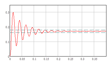 Рис. 5.1 По рисунку (5.1) определим: hmax =0.3; h уст =0.17; h (0) =0, время регулирования на уровне 0.05 (hуст -h(0)). Коридор: [0.95 (hуст -h(0)); 1.05 (hуст -h(0))]. Коридор: [0.1615; 0.1785]. Время регулирования: t рег = 0,15 с. Перерегулирование равно: