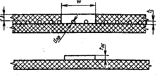 При больших размерах окон трафаретов (более 2 мм) в припойной пасте могут появляться пробелы (пустоты, углубления). Для исключения этого недостатка рекомендуется большие окна разделять на несколько малых, как это показано на рис. 5. При этом следует использовать следующие рекомендации: • если размер контактной площадки равен 2—3 мм, то число окон выбирается равным 2, если 3-4 мм, то 3 (рис. 3.15); • расстояние между внешней кромкой окна и контактной площадкой выбирается в соответствии с приведенными выражениями и составляет 0,05 и 0,015 мм;