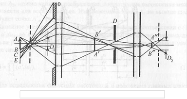 Рис. 3. К определению поля зрения оптической системы Можно показать, что глубина пространства А3 (в сторону к объективу) меньше, чем в сторону удаления от плоскости наведения (А2). Глубина изображаемого пространства увеличивается с увеличением расстояния а до передаваемого объекта и с уменьшением диаметра диафрагмы D, ограничивающей входной световой поток. Роль диафрагмы, ограничивающей световой поток, существенна в формировании изображения не только в отношении глубины пространства, отображаемого с заданной резкостью. Диафрагмы определяют и ту часть сцены в направлении, перпендикулярном оптической оси, которая может быть отображена на изображении, т.е. определяют поле зрения оптической системы. Положим, что в (рис.3) - действительная диафрагма, которая ограничивает пучок световых лучей, участвующих в формировании изображения, - апертурная диафрагма, Dx uD2 - изображения этой диафрагмы в передней и задней частях оптической системы. Если Dyили D2 заменить реальными диафрагмами, то они будут ограничивать световой поток так же, как диафрагма D. На основании этого в оптике вводят понятие о входном зрачке Di - действительном отверстии или его изображении, которое ограничивает падающий световой пучок. Выходным зрачком D2 называют изображение входного зрачка всей системой. Входной зрачок определяет пучок световых лучей, участвующих в формировании изображения. Однако не все световые лучи, прошедшие через входной зрачок, пройдут через оптическую систему. Действительно, пучок от точки Е минует активную часть оптической системы и, как видно из рис.3, будет поглощен оправой О. Пучок от точки С лишь частично пройдет через систему и создаст изображение с уменьшенной освещенностью. Таким образом, периферийная часть изображения будет затемнена за счет частичного поглощения пучка; это явление называют виньетированием. Поле зрения системы оказалось в рассматриваемом случае ограничено оправой входного звена системы. Ограничение поля зрения может осуществляться и другими элементами системы или специально введенной диафрагмой поля зрения. Качество телевизионного изображения в значительной мере определяется освещенностью оптического изображения на входе преобразователя. Для выполнения соответствующих расчетов следует установить связь между освещенностями изображения Ет и передаваемой сцены (объекта) Fo 6 . 1) свет поступает в систему в виде параксиальных пучков; 2) пучки составляют небольшие углы с оптической осью системы; 3) показатель преломления оптических элементов постоянен для всех лучей независимо от длины волны. Невыполнение указанных условий приводит к появлению аберраций - искажений изображения, создаваемого оптической системой. Основные аберрации можно разделить на монохроматические, проявляющиеся при использовании широких, а также узких внеосевых монохроматических пучков, и хроматические, возникающие при формировании изображении пучками света с широким спектром длин волн. В связи с тем что расчеты аберраций оптических систем относятся к специальным разделам оптики, ограничимся перечислением тех из них, которые могут в большей степени проявиться при формировании оптического изображения на входе ТВС. Параксиальный пучок, как было показано выше, дает изображение точечного объекта А, например расположенного на оптичес