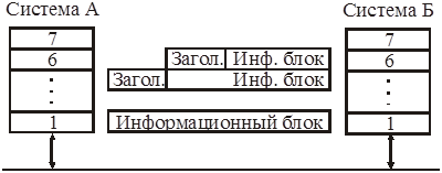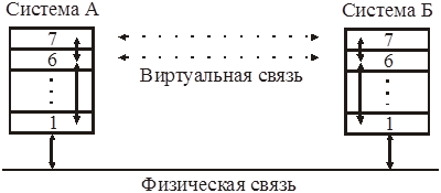 Рис. 1.1. Пример связи уровней OSI В качестве примера связи типа OSI предположим, что Система А на Рис. 1.1 имеет информацию для отправки в Систему В. В этом случае информация из прикладного процесса через уровень 7 сообщается с уровнем 6, который модифицирует информацию, делая ее понятной для уровня 5 и т.д. вплоть до физического уровня системы А. На стороне системы В осуществляется обратное преобразование, начиная от низших уровней до самого верхнего. Следовательно, каждый уровень Системы А использует услуги, предоставляемые ему смежными уровнями, чтобы осуществить связь с соответствующим ему уровнем Системы В. Нижестоящий уровень называется источником услуг, а вышестоящий - пользователем услуг. Взаимодействие уровней происходит в так называемой точке предоставления услуг. Обмен управляющей информацией между соответствующими уровнями системы OSI осуществляется в виде «заголовков», добавляемых к информационной части. В принимающей системе осуществляется анализ этой информации с последующим удалением соответствующего заголовка перед передачей на верхний уровень.