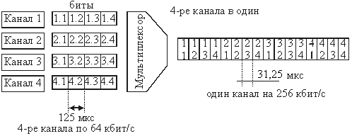 3.3. Иерархии цифровых систем передачиСтруктура первичной сети предопределяет объединение и разделение потоков передаваемой информации, поэтому используемые на ней системы передачи строятся по иерархическому принципу. Применительно к цифровым системам этот принцип заключается в том, что число каналов ЦСП, соответствующее данной ступени иерархии, больше числа каналов ЦСП предыдущей ступени в целое число раз, а именно последующий уровень строится на основе n-числа каналов предыдущего уровня. Цифровая система передачи, соответствующая первой ступени иерархии, называется первичной; в этой ЦСП осуществляется прямое преобразование относительно небольшого числа первичных сигналов в первичный цифровой поток. Системы передачи второй ступени иерархии объединяют определенное число первичных потоков во вторичный цифровой поток и т.д. В рекомендациях МСЭ-Т представлено два типа иерархий ЦСП: плезиохронная цифровая иерархия (ПЦИ) и синхронная цифровая иерархия (СЦИ). Первичным сигналом для всех типов ЦСП является цифровой поток со скоростью передачи 64 кбит/с, называемый основным цифровым каналом (ОЦК). Для объединения сигналов ОЦК в групповые высокоскоростные цифровые сигналы используется принцип временного разделения каналов. 3.3.1. Основы мультиплексированияЦифровые системы передачи работают с двумя типами сигналов: непрерывные и дискретные. В первом случае, при мультиплексировании цифровыми системами необходимо предварительная дискретизация сигнала с последующим формированием группового сигнала. Принципы таких операций рассмотрены при описании работы систем импульсно-кодовой модуляции. При обработке дискретного сигнала, системы имеют дело уже с двоичным сигналом. При мультиплексировании таких сигналов, на входе с мультиплексора имеются n двоичных входных последовательностей. Коммутатор мультиплексора может последовательно отбирать из каналов любую логически осмысленную для данной сетевой топологи, последовательность бит, составляя из них выходную последовательность. Такой процесс называется интерливингом (чередованием). Различают такие виды интерливинга: - бит-интерливинг или чередование бит – на выход коммутируются последовательно по одному биту из каждого канала. - байт-интерливинг или чередование байтов – на выход коммутируются последовательно по одному байту из каждого канала. - символьный интерливинг или чередование символов – на выход коммутируются последовательно по одному символу (поле длиной 7 бит – ASC2 код – американская версия, или 8 бит – ASC2 код - международная версия) из каждого канала. - блок-интерливинг или чередование блоков – на выход коммутируются последовательно по одному блоку из каждого канала. На пример покажем принцип мультиплексирования с бит-интерливингом. Из каждого канала по 64 кбит/с выходят 4-ре бита, каждый длительностью 125 мкс. Время передачи блока с одного канала 500 мкс. При формировании группового канала уменьшается длительность одного бита до 31,25 мкс. В результате в 500 мкс помещается 16 бит из 4-ех каналов. Таким образом, скорость в групповом канале составляет 256 кбит/с.
