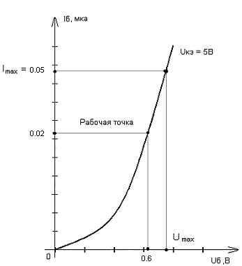 Хорошими параметрами обладает транзистор типа КТ3102Г. Его выходные и входные характеристики представлены на (рис. 8), (рис. 9) По характеристикам находим напряжение и ток базы транзистора VT2 в рабочей точке, их амплитудные значения: ![]()