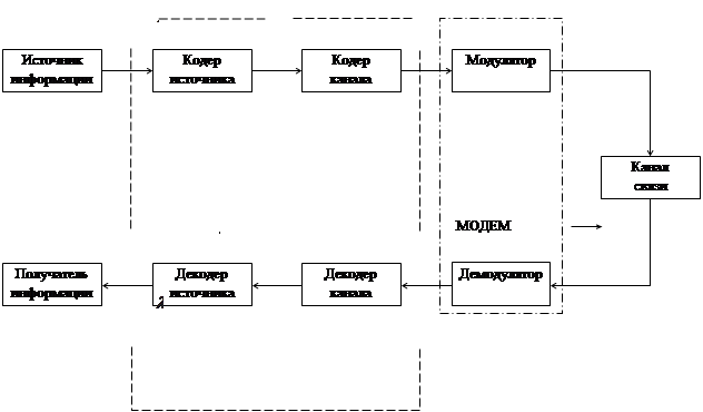 Рис. 1. Хотя эта модель и содержит основные элементы, присущие любой системе передачи информации, она может служить лишь простейшей иллюстрацией к описанию РТС ПИ, поскольку практически не отражает тех действий, которые должны выполняться (или могут выполняться) над информацией в процессе ее передачи от источника к потребителю. Значительно более полной в этом смысле является модель системы передачи (и хранения) информации, подобная приведенной на рис.2, которой мы и будем пользоваться в дальнейшем. Нужно отметить, что на самом деле проблемы, возникающие при передаче (причем не только с использованием радиоволн) и хранении информации (на оптических дисках, магнитных носителях и в памяти компьютеров) очень схожи, поэтому методы их решения и структура технических устройств также во многом идентичны.