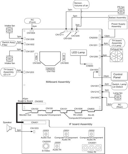 Оптическая система состоит из четырех блоков (собрание Лампы, световедущий модуль, POP (модуль призмы и свет клапаны (РГБ)), модуль линзы Проектирования). Ряд этих модулей называют оптическим механизмом.