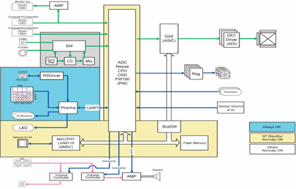 Конструктивно все стабилизаторы и транзисторные сборки размещены на главной плате. Блок питания подключается к ней через разъем CN100. Следует обратить внимание на то, что импульсный преобразователь постоянно находится под напряжением, если проектор подключен к сети. От напряжения 5 В (контакты 3,4 CN2/102) питается дежурный стабилизатор напряжения 1,8 В на микросхеме IC105. С него напряжение подается на микросхему IC704. Все остальные вторичные напряжения появляются только в рабочем режиме. Для коммутации напряжения 5 В от блока на входы стабилизаторов используется ключ Q104 1С 102, а для коммутации 13 В-ключи Q100 IC100 и Q101 IC100. Эти ключи управляются сигналами SW_POWER и SW_LVDS с выв. 98 и 67 IC704.