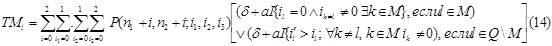 а также вероятность перехода равна нулю, если: 1) 2) Для обоснования правильности формул времени необходимо учитывать следующие положения: 1) если поступает сообщение, а соответствующий буфер занят полностью, то сообщение теряется, и при подсчете поступивших сообщений оно не учитывается; 2) если сообщение не передается, то из данного буфера оно никуда не может исчезнуть, поэтому если при переходе из некоторого состояния в соседнее какое-то сообщение теряется, то вероятность данного перехода равна 0; 3) при передаче сообщения из АС, на которой есть маркер, буфер данной станции блокируется; 4) со станции с маркером может передаваться не более одного сообщения; 5) на тех станциях, на которых нет маркеров, может быть вероятность равна единице в том случае, если в i-том периодическом классе и в (i+1) – вом буфер станции был полностью занят. В приложении будет предоставлены матрицы переходов для рассматриваемой КЛВС. Обозначение 2.3 Определение стационарных вероятностей состояний многомаркерной, несимметричной КЛВС с буферами различной емкости, с N АС и k = N маркерами, с ординарной дисциплиной обслуживания Будем рассматривать поведение КЛВС в моменты поступления маркеров на АС. В этом случае изменение состояний КЛВС образуют конечную цепь Маркова. Под состоянием КЛВС будем понимать состояние всех АС кольца в момент поступления на них маркеров. Каждая АС может находиться всегда в одном из Все состояния КЛВС делятся на N периодических классов, каждый из которых содержит в рассматриваемом случае Особенности протокола приводят к тому, что указанная цепь Маркова является неприводимой, периодической с периодом, равным N. Некоторый j-тый класс (j Закодируем состояния КЛВС парами чисел (i, r), i=( Введем обозначение M=( Обозначим через Так как поток сообщений пуассоновский, то имеем: