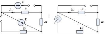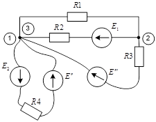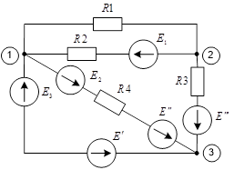 рис. 2.8.7 Проверим, изменились ли токи? Представим, что мы имели уравнения для схемы рис. 2.8.6. В схеме рис. 2.8.7 осталось столько же ветвей и столько же узлов, структура схемы такая же, следовательно, такими же останутся уравнения по I закону Кирхгофа. Уравнения по II закону Кирхгофа изменятся, т.к. в правой части этих уравнений появятся дополнительные источники ЭДС,