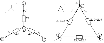 Для решения таких задач необходимо знать правило перехода от заданной "звезды" к некоторому эквивалентному "треугольнику" сопротивлений и наоборот. И для схемы "звезда" и для схемы "треугольник" получим выражения через потенциал для токов ветвей подходящих к этим соединениям. Потребуем, чтобы эти токи ветвей и разности потенциалов соответствующих узлов остались неизменными.