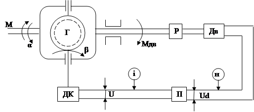 Одновісний гіроскопічний стабілізатор призначений для стабілізування кута повороту в приладах, що рухаються. Принцип дії цих приладів наступний: Коли обурюючий момент не співпадає з моментом двигуна, в гіроскопі утворюється кут прецесії, який в датчику кута перетворюється в електричну величину. Вона далі підсилюється в підсилювачі і починає керувати двигуном. Причому в залежності від полярності даної величини двигун починає обертатися у відповідну сторону і через редуктор впливає на гіроскоп. Коли обурюючий момент співпадає з моментом двигуна, кут прецесії дорівнює нулю, а отже, дорівнює нулю і сигнал датчика кута. 3. Аналіз і синтез лінійної САК