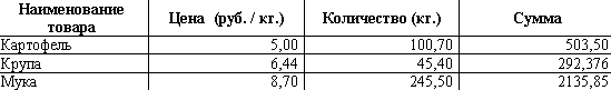 Рисунок 13 Здесь данные, которые содержатся в колонках Наименование товара, Цена (руб. / кг.), Количество (кг.)- основные, а данные в колонке Сумма- производные, т.к. вычисляются по формуле: Сумма = Цена * Количество Формула это некоторое математическое выражение, совокупность операций и операндов, так же как и в математике. Основное отличие от математики состоит в том, что в качестве неизвестных здесь могут и должны использоваться имена других ячеек Excel. Порядок действий определяется именно так, как нас учили в школе. Можно использовать скобки, в том числе и вложенные. Еще раз напомним, что формула обязана начинаться со знака равенства, иначе она будет считаться текстом. Значение это числовая константа, вычисляемая по формуле. В случае, когда в ячейке хранятся основные (независимые) данные значение и формула совпадают (в математике мы сказали бы, что выражение равно константе). Рассмотрим таблицу из примера и ее реализацию в Excel.