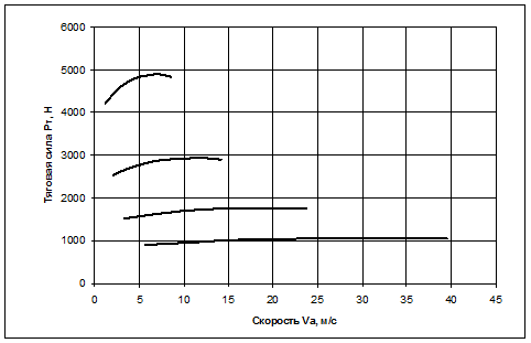 Рисунок 2 - Тяговая характеристика автомобиля Тяговое усилие, подводимое к ведущим колесам автомобиля, расходуется на преодоление сопротивлений качению, воздуха, подъему, инерции. Сопротивление воздуха определяется соотношением (Н): Рв =Кв *F*Va ² (23) Результаты расчетов сводим в таблицу 3 IРв=0.3*1.848*1.22²=0.82 H IIРв=0.3*1.848*2.03²=2.28Н Аналогично проводим расчёт для каждой из передач для следующих значений оборотов коленвала двигателя, и результаты расчётов сводим в таблицу 3. Таблица 3 - Сила сопротивления воздуха