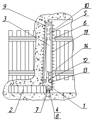 1- режущий орган; 2 – транспортирующий орган (ротор); 3 – рама; 4 – привод поворота; 5 – цепь; 6 – резец; 7 – звездочка; 8 – привод цепи; 9 – звездочка; 10 – ось; 11 – направляющие; 12 – кронштейн; 13 – направляющие ролики; 14 – палец Рисунок 2 – Устройство для выемки балласта с железнодорожного пути Оси 10 расположены на удаленном от транспортирующего органа 2 конца рамы 3. На вторых концах направляющих 11 жестко закреплены кронштейны 12, несущие свободно вращающиеся ролики 13, при помощи которых направляющие 11 с кронштейнами 12 могут быть зафиксированы на раме 3, на которой также выполнены отверстия пальцев 14. При вытаскивании пальцев 14 из отверстий направляющие 11 могут поворачиваться вокруг осей 10. Расположенные напротив друг друга поверхности кронштейнов 12 имеют в плане скосы в продольном направлении кронштейнов (клиновидные поверхности) кронштейнов 12 взаимодействует ролик, соединенный с приводом возвратно-поступательного перемещения по стрелкам. Этот привод, например, может представлять собой винтовую пару и с роликом образует механизм раздвижки кронштейнов 12 в горизонтальной плоскости. Направляющие 11 для цепи 5 с кронштейнами 12, связанными с указанным механизмом их раздвижки, образуют орган для изменения траектории движения цепи 5. Транспортирующий орган 2 монтируется в зоне разгрузки цепи 5 и может состоять из ковшового ротора. Устройство работает следующим образом: в транспортном положении режущий орган 2 находится в поднятом положении, при этом располагается вдоль путевой машины. При подходе к зоне вырезки балласта орган 2 опускается на необходимую величину вырезки балласта. Затем путевая машина перемещается с работающим ковшовым ротором, который вырывает траншею длиной, равной длине режущего органа 1. Траншея вырывается за торцами шпал вдоль пути. Ковшовый ротор вращается производя вырезку балласта. Затем в вырытую траншею опускается режущий орган 1 с перемещающимся приводом 8 цепью. При перемещении путевой машины с работающими органами 1 и 2 частицы балласта и засорителей захватываются резцами 6 цепи 5 и перемещаются в зону разгрузки цепи 5 и загрузки рабочего органа 2. При подходе к ковшам ротора цепь 5 с резцами 6 изгибается при помощи органа для изменения траектории ее движения, при этом в зоне изгиба цепи 5 увеличивается линейная скорость перемещения резцов 6. При увеличении скорости резцов 6 частицы балласта и засорителей перемещаются с увеличением скорости и отбрасываются под ковши ротора. Ковши ротора перемещают балласт и засорители к устройству для очистки балласта или перегрузочному устройству, которое направляет вырезанный балласт с засорителями в спецсостав или сбрасывает его сбоку от пути. Для придания цепи 5 нужной формы в плане необходимо расфиксировать одну направляющую 11, извлекая палец 14 из отверстий рамы 3 и соответствующего кронштейна 12. Вторая направляющая 11 при этом по-прежнему зафиксирована. При возвратно-поступательном движении ролика 15 он воздействует на скос поверхности 15 кронштейна 12, разворачивая при этом одну направляющую 11 вокруг оси 10. Направляющая 11, периодически отклоняясь, меняет траекторию движения цепи 5, раздвигая ее в плане до тех пор, пока цепь 5 не достигнет необходимого натяжения. При этом цепь 5 направляется звездочкой 7, свободно вращающейся на кронштейнах 12 роликами 13, направляющи