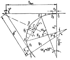 Рисунок 2 – Разбивка сопряжения проезжей части на пересечениях и примыканиях Сопряжение кромок проезжих частей пересекающихся дорог осуществляется с учетом категории дороги, с которой происходит съезд. Съезд выполняют по коробовой кривой, состоящей из трех круговых кривых (рис. 1): входной Таблица 1