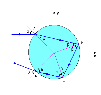 Внутри капли идет по прямой луч АВ. В точке В происходит частичное преломление луча и частичное его отражение. Надо заметить, что, чем меньше угол падения в точке В, а следовательно и в точке А, тем меньше интенсивность отраженного луча и тем больше интенсивность преломленного луча.
