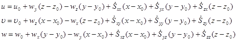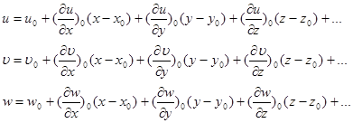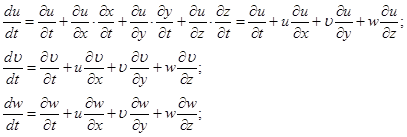 x , y , z – переменные Эйлера. Чтобы определить скорости в какой-либо точке надо задать ее координаты. Поле ускорений потока можно получить если продифференцировать систему (3):