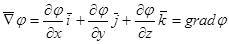 В стационарных задачах линии тока и траектории совпадают, т.к. нормальная составляющая скорости к линии тока равна нулю, жидкость через линию тока не перетекает. В плоских течениях количество жидкости между двумя линиями тока в любых сечениях будет одинаково. Если линии тока приближаются, то скорость потока увеличивается, и наоборот. Через каждую точку в потоке можно провести только одну линию тока, исключение составляют особые точки: критические точки. А и В – это критические точки. Поверхность непроницаемого тела – поверхность тока, а линии тока, расположенные на поверхности называется нулевыми линиями тока. Если в жидкости провести замкнутый контур и через каждую точку провести линию тока, получим поверхность тока. Жидкость внутри поверхности называется трубкой тока. Через поверхность тока жидкость не перетекает, следовательно через каждое сечение трубки тока проходит одно и то же количество жидкости. Если через каждую точку контура провести траекторию, то часть жидкости, которая ограничена поверхностью траектории называется струей. Струя совпадает с трубкой тока в стационарном течении. 4. Градиент, дивергенция, циркуляция, вихрь 1. Градиент. Рассмотрим действие векторного оператора Гамильтона на скалярную функцию φ. Скалярная величина – это параметр, которому нельзя придать направление.