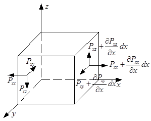 Для определения главного вектора поверхностных сил рассмотрим все силы, дающие проекцию на ось х . Для граней перпендикулярных х проекцию дают только силы, создаваемые нормальными напряжениями. Поэтому равнодействующая этих сил равна: