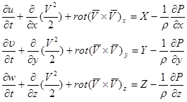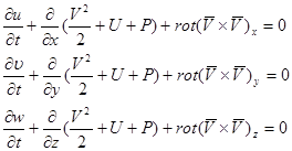 - система уравнений Эйлера в форме Громека Достоинство системы заключается в том, что отдельно выделен ротор, который при определенных условиях может быть равен нулю и система значительно упрощается. Последний член равен нулю, если: 1) Сумма, стоящая во второй компоненте, имеет определенный физический смысл. В векторной форме система может быть записана в виде одного уравнения: