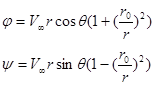 Исследованный потенциал определяет течение, которое называется потенциальным вихрем. Окружная скорость изменяется по гиперболе. 17. Безциркуляционное обтекание круглого цилиндра Рассмотрим комплексный потенциал, представленный в виде суммы двух, один из которых – поток плоскопараллельного течения, другой – диполя.