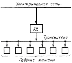 Рисунок 2.1 – Структурная схема группового трансмиссионного электропривода Вследствие своего технического несовершенства трансмиссионный электропривод в настоящее время почти не применяется, он уступил место индивидуальному и взаимосвязанному,хотя в ряде случаев еще находит применение и групповойпривод по схеме на рисунке 2.2.