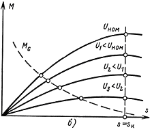 Рисунок 6.3 – Механические характеристики двигателя с короткозамкнутым ротором при регулировании напряжения на статоре Лучшее использование двигателя и более благоприятные характеристики могут быть получены, если применить двигатель с фазным ротором, в роторную цепь его включить дополнительный нерегулируемый резистор и регулировать напряжение на статоре (рис. 6.4, а). Механические характеристики для рассматриваемого способа приведены на рис. 6.4, б. Преимущество этого способа по сравнению с реостатным заключается в том, что управление двигателем осуществляется плавно и исключается контактная аппаратура в роторной цепи. Потери энергии в приводе получаются примерно такими же или несколько больше, как и при реостатном регулировании; потери мощности скольжения в основном выносятся из двигателя и выделяются в дополнительном резисторе, что увеличивает допустимый момент. Этот способ может быть использован при вентиляторной нагрузке для продолжительного режима, а при Мс = const для кратковременного режима работы. Очевидно, что регулирование изменением напряжения может быть осуществлено только вниз от основной угловой скорости. Механические характеристики (рис. 6.4, б) по мере снижения напряжения становятся мягкими и не обеспечивают стабильности угловой скорости при возможном отклонении нагрузки. Кроме того, наличие постоянно включенного резистора приводит к недоиспользованию двигателя по скорости (угловая скорость всегда меньше номинальной) и по мощности. Повышение стабильности угловой скорости и расширение диапазона регулирования до (5