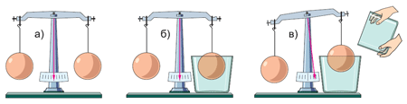 Заполним стакан углекислым газом, плотность которого больше плотности воздуха (рис. «в»). Равновесие нарушится, показывая, что вес правого шара стал меньше. Это произошло потому, что на шар в углекислом газе действует большая архимедова сила, чем в воздухе.