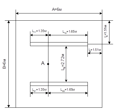 Рис.1 - план помещения №1. 3. Определяем длины полурядов и расстояние от контрольной точки до проекции рядов на рабочую поверхность (Рис.1). L11 =L21 =Нр /2=1.35м. L12 =L22 = А - 2lа - L11 = 6 - 2 ·1,51 - 1,35 = 1,65м. Р1 =Р2 =1.51м. 4. Определяем приведённые размеры: L′11 =L′21 =L11 /Нр =1,35/2.7=0,5 L′12 =L′22 = L12 /Нр =1,65/2.7=0,61 Принимаем L′12 = 1. Р′1 =Р′2 =1,51/2,7=0,55 По рис.3.10 определяем условную освещённость в контрольной точке от всех полурядов (светильник ЛСП 18-40 имеет кривую силы света Д-1), для которых приведённое расстояние Р′≤4: е11 =60лк; е21 =60лк; е12 =70лк; е22 =70лк; Суммарная условная освещённость в контрольной точке: ∑еа = е11 + е21 + е12 + е22 = 60 + 60 + 70 + 70 = 260 лк. 5. Определяем расчётное значение линейной плотности светового потока Ф′р= где Ен - нормированное значение освещённости рабочей поверхности, лк; Кз - коэффициент запаса; µ - коэффициент добавочной освещённости, учитывающий воздействие "удалённых" светильников и отражённых световых потоков на освещаемую поверхность (принимаем равным 1.1…1.2); 6. Выбираем тип источника света (табл. П.3.33) в зависимости от характеристики зрительной работы - различие цветных объектов без контроля и сопоставления при освещенности 150лк. Принимаем лампу типа ЛД и учитывая мощность светильника, окончательно - ЛД-40. По табл. П.2.7, поток лампы Фл=2500 лм. 7. Количество светильников в светящемся ряду длиной Lр = А - 2·lа = 6 - 3 = 3 м N1