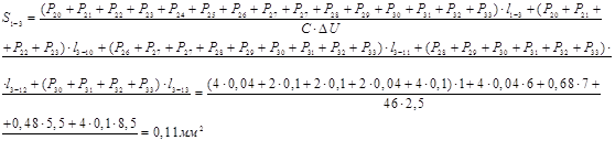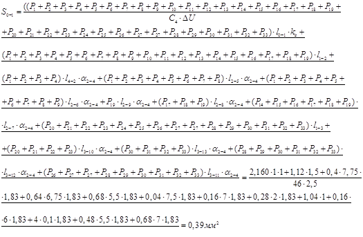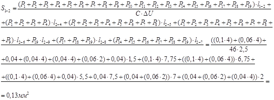 где S- сечение проводов участка, мм2 ; ∑М = ∑Рl- сумма моментов рассчитываемого и всех последующих участков с тем же числом проводов, что и у рассчитываемого, кВт·м; ∑αm- сумма моментов всех ответвлений с числом проводов, отличающихся от числа проводов рассчитываемого участка, кВт·м; α - коэффициент приведения моментов, зависящий от числа проводов рассчитываемого участка и в ответвлениях [3] П.5.3; С - коэффициент зависящий от материала проводов, системы и напряжения сети,