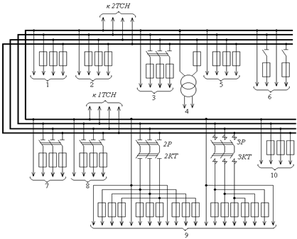 Рис.3. Принципиальная схема питания СН переменного тока открытой части тяговой подстанции: фидеры: 1 и 10 – шкафа СН в здании подстанции; 2 – обдува понижающих трансформаторов; 3 – ВЛСЦБ; 4 – освещения камер 10 кВ и СЦБ; 5 – резервный; 6 – освещения открытой части подстанции; 7 – передвижного масляного хозяйства; 8 – питания дистанций контактной сети; 9 – подогрева элегаза и приводов высоковольтных выключателей и ячеек КРУН.