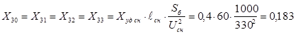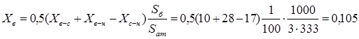 Хс =Sб /(1,73*Iпо.вн *Uвн )= 63·106 /(1,73*1655,28*330000)= 0,067 о. е. Сопротивление трансформаторов