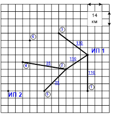 Вывод: в данной главе для каждого пункта были построены графики нагрузок в именованных единицах, затем, просуммировав графики, определили максимальную суммарную активную и реактивную мощности нагрузки, активные мощности источников питания без учёта потерь, а также нашли часы, в которые достигается максимум нагрузки. После этого была определена потребная району активная мощность и годовое потребление электроэнергии, составлен баланс реактивной мощности и выбраны компенсирующие устройства, также были рассчитаны параметры нагрузки с учётом компенсации реактивной мощности (Q'i , cosji ¢), необходимые для дальнейших расчётов. 3. Конфигурация, номинальное напряжение, схема электрических соединений, параметры основного электрооборудования сети3.1 Составление рациональных вариантов схем развитие сетиСоставим несколько вариантов схем развития сети, для каждого из вариантов найдём суммарную длину воздушных линий электропередач. Схема должна быть надежной, гибкой, приспособленной к разным режимам распределения мощности, возникающих в результате изменений нагрузок потребителей, а также при плановых и аварийных отключениях. Схема должна обеспечивать оптимальный уровень токов к. з. Построение электрической сети должно соответствовать условиям охраны окружающей среды. Одним из важнейших требований к конфигурации и схеме сети является возможность её построения из унифицированных элементов - линий и подстанций, с возможно наименьшими изменениями существующей сети. Для заданного географического расположения новых пунктов нагрузки, второго источника питания и имеющейся схемы старой сети электроснабжения района составим два варианта схемы развития сети и для каждого из вариантов найдём суммарную длину новых линий (с учётом 5% надбавки из-за рельефа местности). Исходя из этих требований рассмотрим два варианта развития сети: