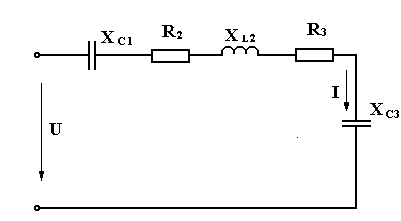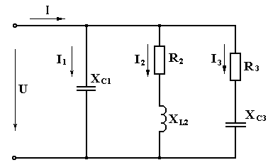 Рисунок 3 Этот метод предусматривает использование схемы замещения с последовательным соединением элементов. В данном случае три параллельные ветви рассматриваются как три отдельные неразветвлённые цепи, подключенные к одному источнику с напряжением U. Поэтому в начале расчёта определяем полные сопротивления ветвей: Z1 = Хс1 = 65 Ом. Z2