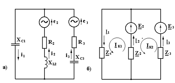 Рисунок 5 Намечаем в независимых контурах заданной цепи, как показано на рисунке 5б, контурные токи I K 1 и I K 2 – некоторые расчётные комплексные величины, которые одинаковы для всех ветвей выбранных контуров. Направления контурных токов принимаются произвольно. Для определения контурных токов составляем два уравнения по второму закону Кирхгофа: