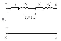 2. Определение параметров схемы замещения трансформатора в режиме короткого замыкания В опыте короткого замыкания вторичная обмотка трансформатора замкнута накоротко, а подводимое к первичной обмотке напряжение подбирается таким образом, чтобы ток обмотки трансформатора был равен номинальному. Схема замещения трансформатора в режиме короткого замыкания представлена на рис. 1.