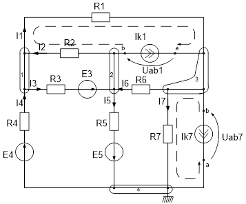 Рисунок 1- Расчетная схема электрической цепи по варианту R1=81Ом E3=120В Ik1=0,12А R2=68Ом E4=300В Ik7=0,9А R3=47Ом E5=120В R4=120Ом R5=47Ом R6=43Ом R7=130Ом Расчет токов ветвей методом узловых напряжений Решение: Задаем положительное направление токов ветвей и напряжений.