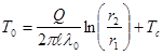 Проволочка, натянутая по оси трубки, выполняет одновременно роль нагревателя и термометра сопротивления. С этой целью берется проволока из материала с большим температурным коэффициентом электрического сопротивления, например вольфрама или платины. Если газовая смесь бинарная и теплопроводности компонентов различны, то теплопроводность газовой смеси, а, следовательно, температура и сопротивление нагреваемой током металлической нити зависят от концентрации одного из компонентов смеси. Температура Тс внутренней поверхности корпуса детектора определяется по результатам измерения температуры ее внешней поверхности с помощью термометра сопротивления или термопар, заделанных в трубку на контролируемом расстоянии. Метод нагретой нити обычно используется в стационарном варианте. При этом поддерживается постоянной либо мощность, выделяемая в нити, либо температура нити. В нашем случае будем полагать, что электрическая мощность, подводимая к нити, постоянная. Для того, чтобы получить расчетную формула для температуры нити, примем следующие допущения: · нить натянута точно по оси трубки; · перенос тепла излучением и конвекцией отсутствует; · теплоемкость газа настолько мала, что ею можно пренебречь; · на внутренней поверхности камеры 2 (см. рисунок 1) поддерживаются граничные условия первого рода. · торцевые эффекты (т.е. утечка тепла в торцевые части камеры 2 через нить) отсутствуют. Тогда, математическая модель температурного поля в газовой смеси, омывающей нить запишется в виде: