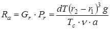 – температуропроводность газовой смеси, м2 /с; где с – удельная теплоемкость газа при постоянном объеме. Очевидно, что значение критерия будет наибольшим при максимальном перепаде температур. Если теплопроводность определяемого компонента больше чем теплопроводность воздуха, то перепад температур будет максимальным при нулевой концентрации определяемого компонента. Таким образом, критерий рассчитывается для воздуха: nв – кинематическая вязкость газовой смеси для воздуха, м2 /с; ав – температуропроводность газовой смеси для воздуха, м2 /с; lв – теплопроводность воздуха, Вт/(м×К). g=9,80665 м/с2 ; nв =13,38×10-5 м2 /с; ав =0,028×10-3 м2 /с; r1 =0,04×10-3 м; lв =0,0258 Вт/(м×К); Из зависимости для критерия Релея выражаем r2 :