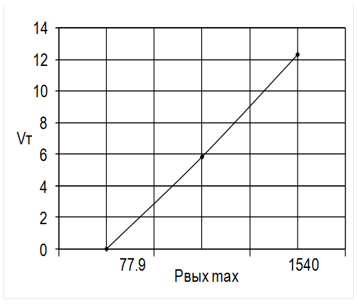 Pвых макс =[2× 3,46× (30000×0,76)2 × ( 1,597-0,352)/(3+3)]0.5 = 10.247 Вт. 2.2.7 По таблице 2.2 определили объём трансформатора, соответствующий вычисленному значению максимальной мощности, т.е. V Т ( P вых.макс ) Vт=1,15см3 . Аналогично проводится расчет и для других сердечников. Вычислили значения Pвых.макс и VТ для типоразмера для К28´16´9: Pвых.макс =1540,71 Вт,Vт=12,28см3 .2.2.8 Построили зависимость Vт (Pвых.макс ). По графику этой зависимости определили ориентировочный объём трансформатора, для которого Pвых.макс = 10 Вт (рис. 2.2.). Получили ориентировочный объём равный: Vт = 0,9 см3 .